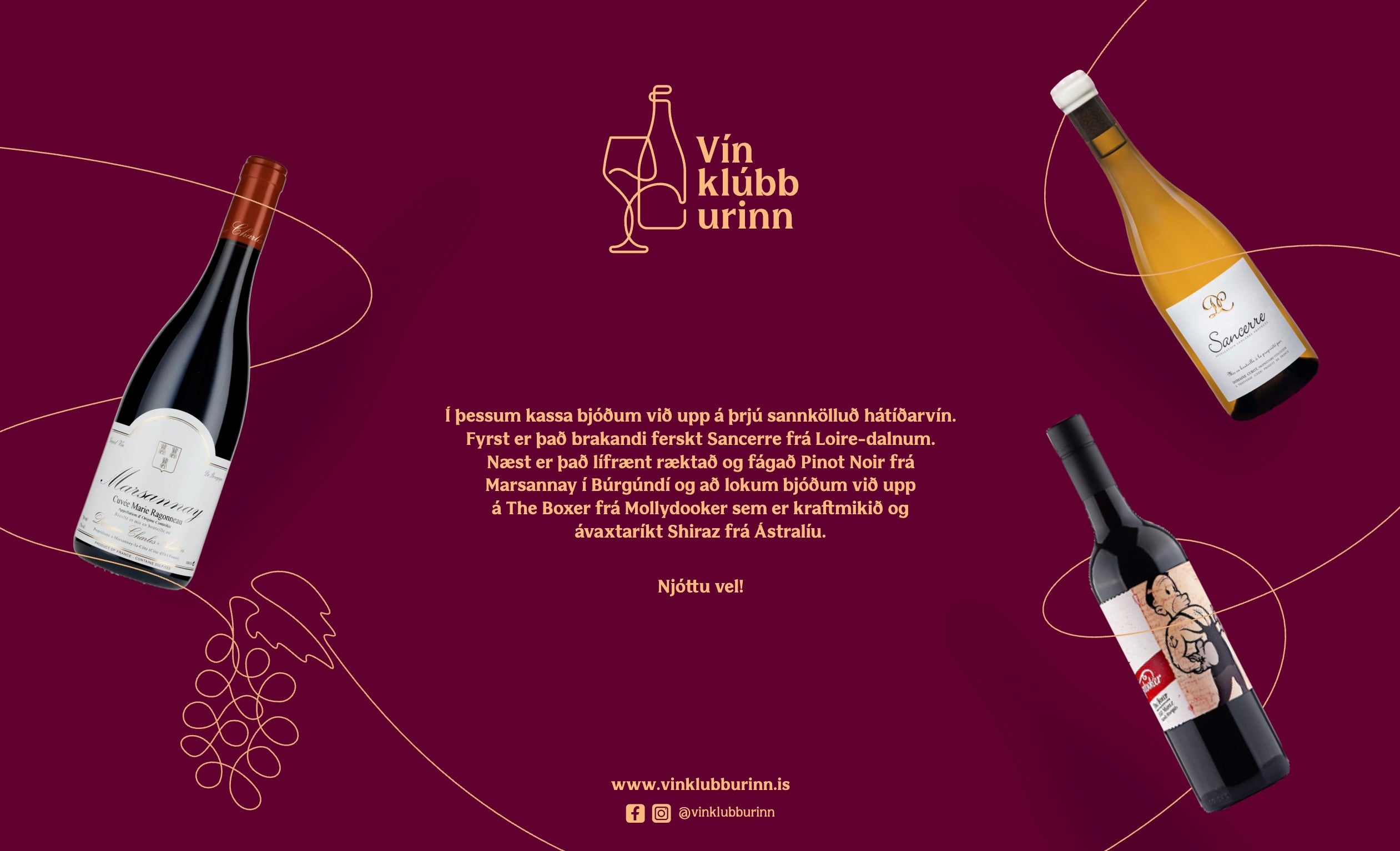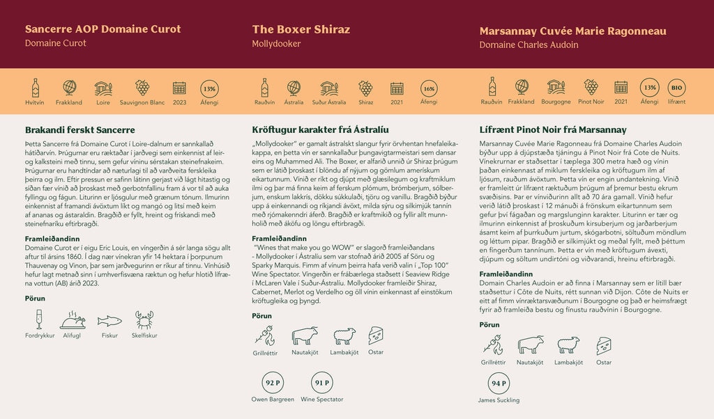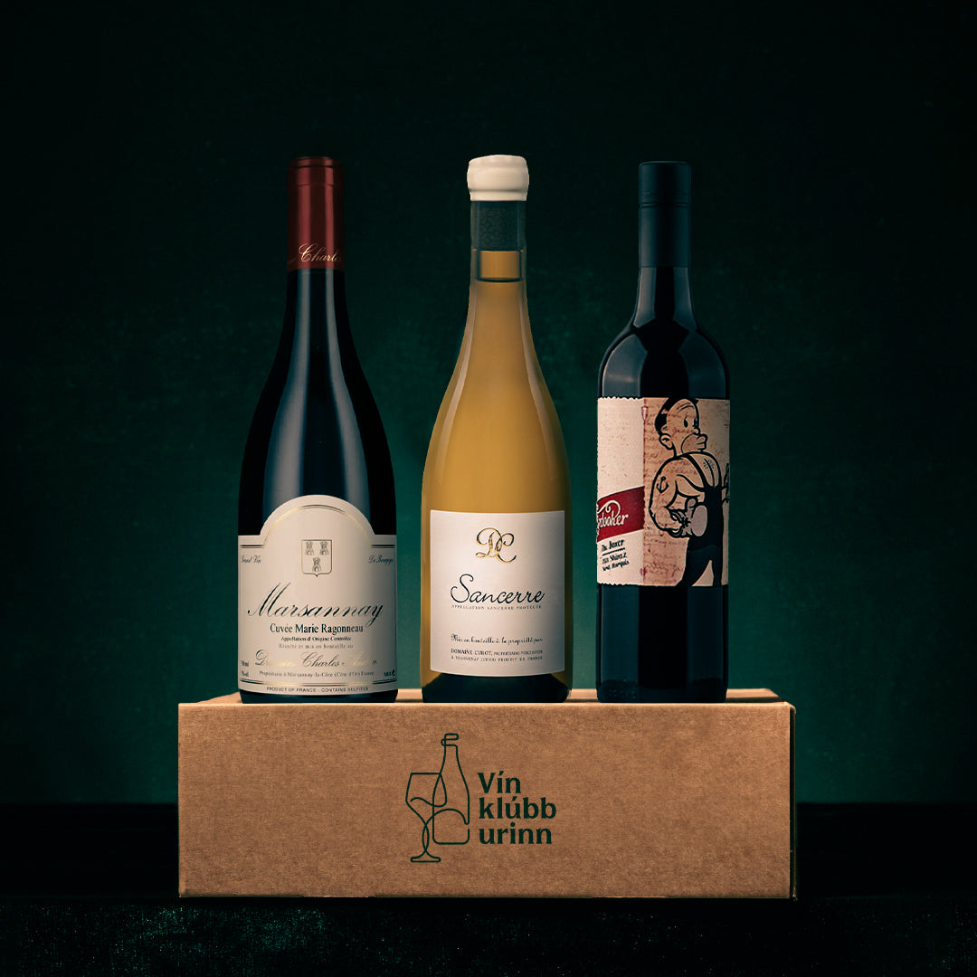 Í jóla- og hátíðarkassanum bjóðum við upp á þrjú sannkölluð hátíðarvín. Fyrst er það brakandi ferskt Sancerre frá Loire-dalnum. Næst er það lífrænt ræktað og fágað Pinot Noir frá Marsannay í Búrgúndí og að lokum bjóðum við upp á The Boxer frá Mollydooker sem er kraftmikið og ávaxtaríkt Shiraz frá Ástralíu. Tvö rauðvín og eitt hvítvín sem smellpassa á hátíðarborðið um jólin, hvort heldur sem er með hamborgarhryggnum, villibráðinni eða humarveislunni. Frábær jólavín!